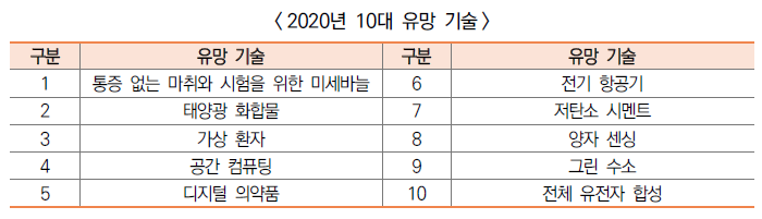 ○ 과학전문지 사이언티픽 아메리칸(Scientific American)과 세계경제포럼(WEF)은 후보에 오른 75개 기술 중 2020년 10대 유망 기술*을 선정