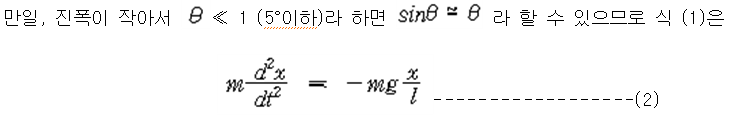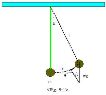 <Fig. 8-1>과 같이 질량이 무시되는 길이 l인 끈에 크기가 무시되는 질량 m인 추가 추중심에서 진자 끝까지의 거리가 l이 되도록 매달려 주기운동을 하는 것을 단진자라 한다. 추 m이 되돌아가려는 힘 F는