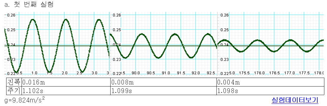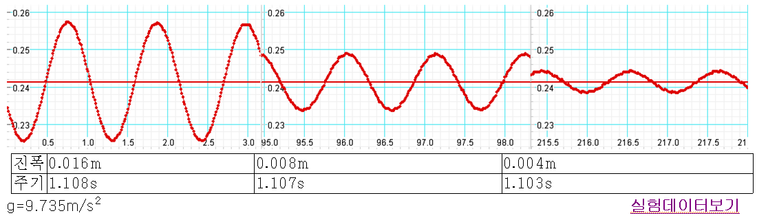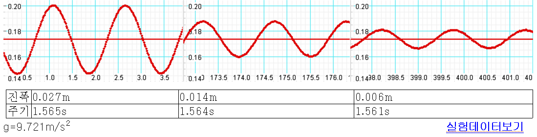 4) 측정한 데이터를 이용하여 진자의 길이, 진폭에 따른 주기를 기록한다. 우선 그래프를 보아서 대략적인 시간을 알고, 테이블을 통해 정확한 수치를 얻는다.