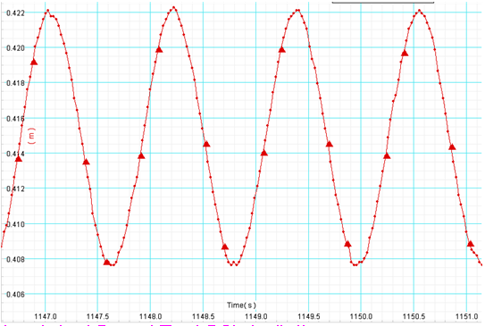 낮은 점의 위치가 불분명하므로 가장 높은 점의 주기를 평균하여 T를 구한다. 실제 시간을 볼 때에는 그래프에서 대략적인 시간을 본 뒤, 표를 이용하여 정확한 시각을 찾아 구한다.(그보다 좋은 방법은 오랫동안 진동시켜 linear fit을 한 뒤, 직선을 중앙값으로 이용하는 것이다. 수십분 동안 진동시키면, linear fit은 거의 기울기가 0이며, 중앙을 지나는 직선이 된다. 중앙의 값은 기울기가 큰 구간이라 점 하나가 명확하게 구분된다.)