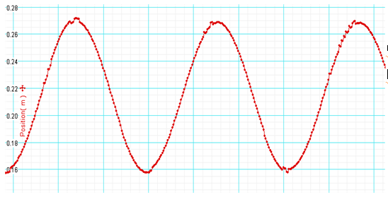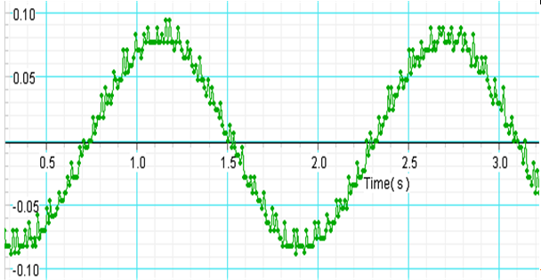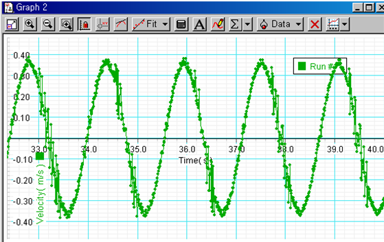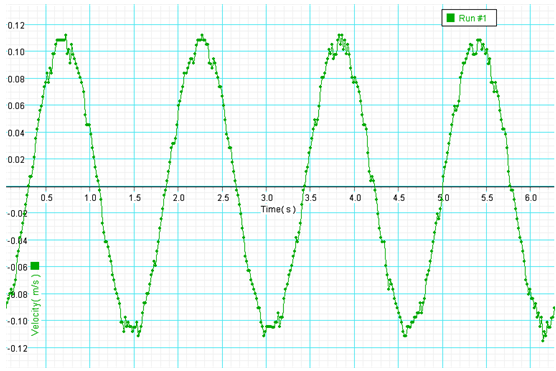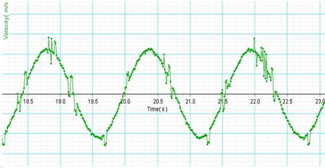 이 그래프(v-t그래프)에서는 사인형 그래프의 오른쪽, 즉 가속도가 음이면서 진동축에서 모션센서와 반대쪽 부분이 측정이 잘 되지 않음을 알 수 있다. 센서를 약간 진자에 가까이 하거나, 추를 약간 낮추거나, 모션센서의 각도를 아주 약간 높여야 한다. 진동면과 모션센서가 일치하지 않아도 일어난다.