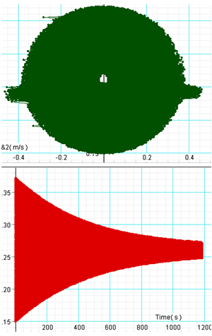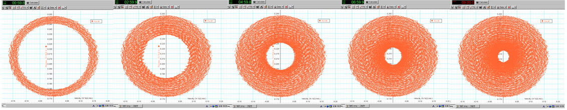 c. 각각 1분, 3분, 5분, 7분, 9분에서의 미급감쇠진동자의 v-x위상공간에서의 궤적. 시간이 갈수록 그래프의 안쪽을 그리는 것을 알 수 있다.(60cm진자. 9분은 짧아서 실험데이터로 쓰이지는 않았음)
