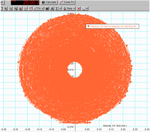 이 그래프는 전체적으로 실험이 잘 된 듯하지만, 그래프에 전체적인 요동이 있음을 알 수 있다. 이 경우는 원인을 잘 알기 힘들었다. 이 요동은 어떠한 경우로도 사라지게 하기는 힘들었다. 추의 미세한 요철에 의해 생기는 것이 아닌가 추측이 가기도 한다. 아니면 센서의 위치 측정 정밀도에 의해 이렇게 될 수 있을 것 같기도 하다.(이 그래프를 자세히 보면 어떤 속도 값 사 이에는 어떠한 값도 없이 계단모양으로 되어있 는데, 위치도 그래프를 벌리면 그 정도가 매우 작지만, 수치가 계단 형으로 되어있다.)