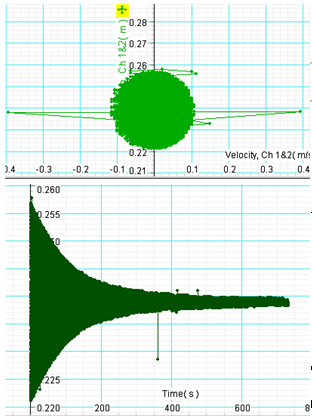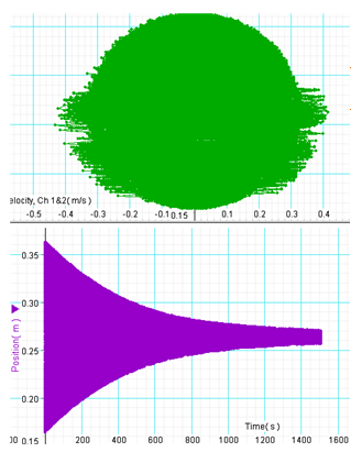 4. 우선 진자를 먼저 진동을 시킨 뒤, 예비로 측정을 하여 나온 그래프를 이용하여 진자와 모션 센서의 위치를 조정하자. 주기측정 같이 비교적 간단한 실험의 경우는 위치그래프만 제대로 나와도 정확한 실험이 가능하다. 하지만, 감쇠진동 실험을 할 때, 위치-속도 위상공간에서 깔끔한 데이터를 얻으려면 속도 그래프의 오차도 고려해야 한다. 예시로 방법을 설명하면 다음과 같다.
