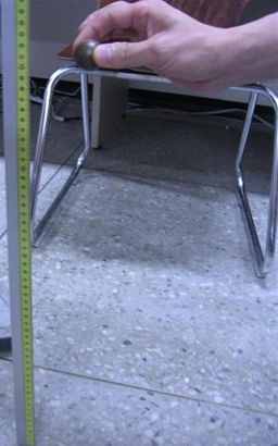 주의 : 여기서 탁구공을 떨어뜨릴 때 양 손가락을 동시에 놓는다. 왜냐하면 동시에 놓지 않으면 공이 약간의 회전으로 인해 큰 오차가 발생할 수 있다.