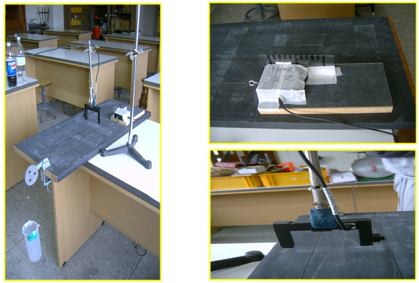 ⑤ 400cw사포표면에 나무토막을 놓고 스탠드에 포토게이트를 옆에 사진처럼 설치하여 나무토막이 움직이는 순간의 t를 측정할 수 있도록 한다.