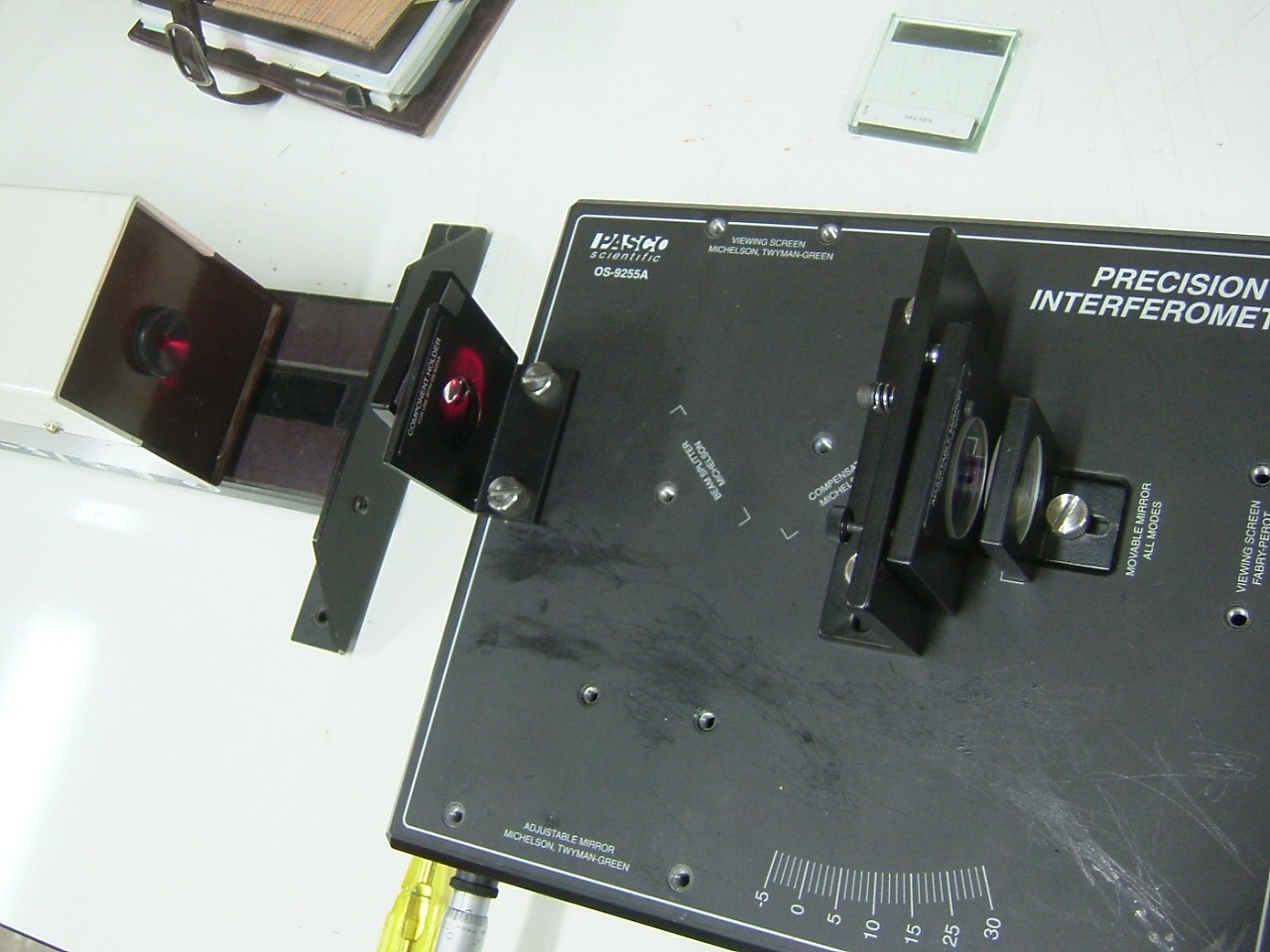 실제 두 광파의 경로차의 변화는 한 경로에 대한 직접적인 거리 변화 방법 외에도 한쪽 팔에 유리판과 같은 고체 매질 혹은 유제 기체 등을 놓음으로써 위상차에 변화를 줄 수 있었다.