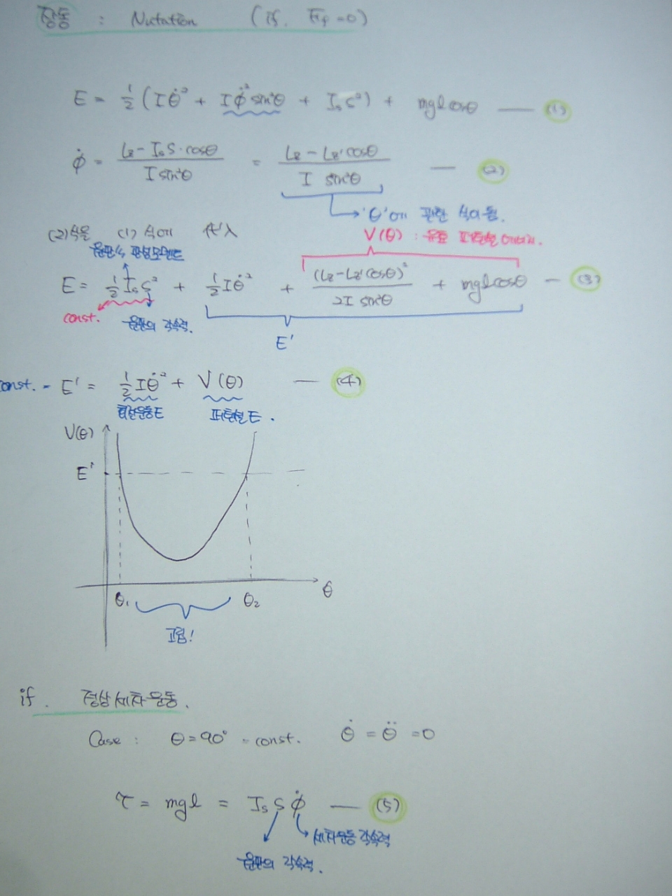 기본적인 접근 방법은 에너지 보존 법칙이다. 아래의 (1)번 식처럼 장동의 에너지를 Euler자표계를 사용하여 나타낼 수 있다. 그런데 여기서 Euler방정식을 유도 하다 보면, (2)식이 주어짐을 알 수 있다. 이것은 세차 운동하는 각속력을 의미한다. 이 값은 “쎄타” 만의 함수라는 것이 중요한 Point가 된다. 우선 (2)식을 (1)식에 대입하면 (3)식이 등장함을 유도해 낼 수 있다. 여기서 첫 번째 항은 판의 회전이 일정하므로 const 한 값이 되고, 두 번째 항은 판이 위아래 즉, “쎄타” 방향으로의 회전운동에너지가 된다. 그리고 이제 남은 세 번째, 네 번째 항이 중요한 데 이를 유효 퍼텐셜이라고 부른다.