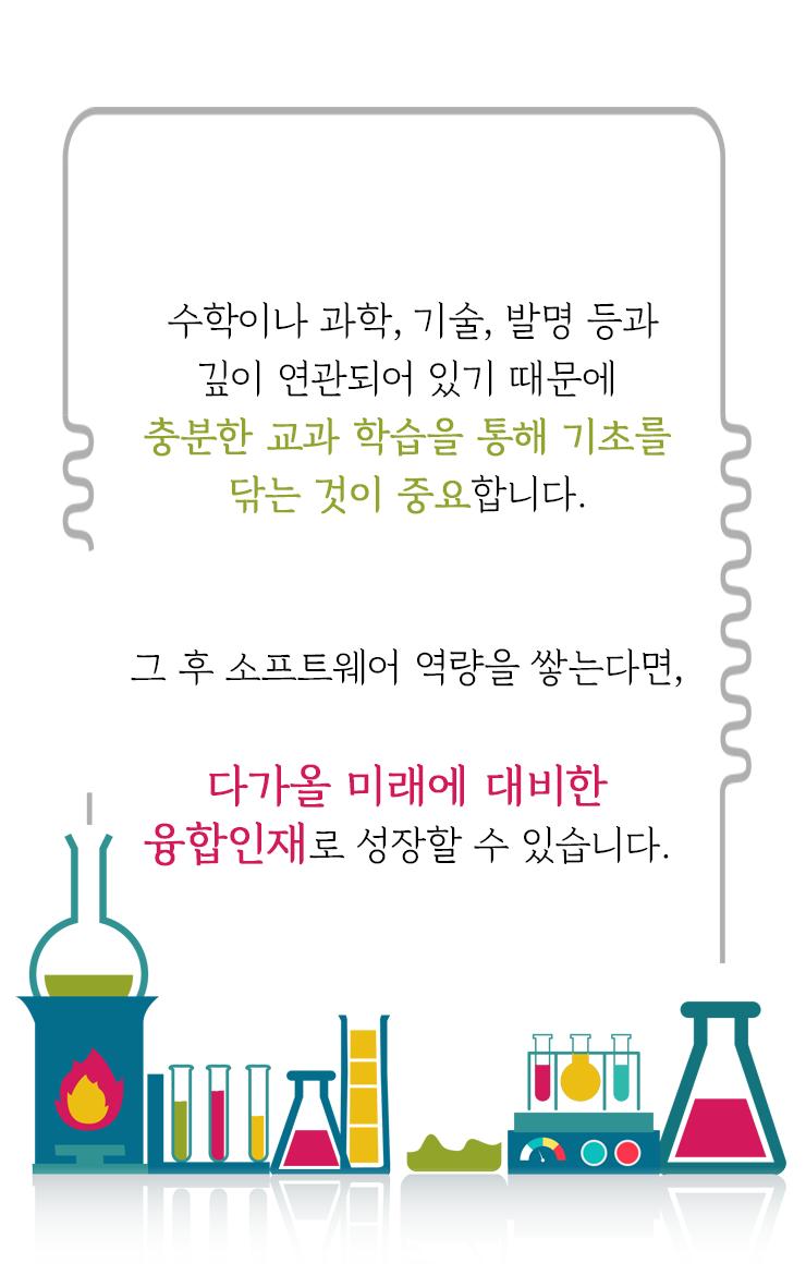 모든 청소년들이 코딩도 잘하고 아두이노, 스크래치 같은 것도 잘 하면 얼마나 좋겠습니까? SW교육이 강조되고 있다고 무작정 덤벼들면 오히려 더 큰 손해가 될 수도 있습니다. 우선 가볍게 접할 수 있는 체험의 기회를 만들어 보기 바랍니다. 그런 다음 관심이 더욱 커진다면, 2~3일 정도의 방학 캠프 프로그램을 다녀오는 것도 좋은 방법입니다. 관심이 더더욱 커졌다면 보다 전문적인 교육을 받아보는 쪽으로 경험을 확장해 나가면 좋습니다.