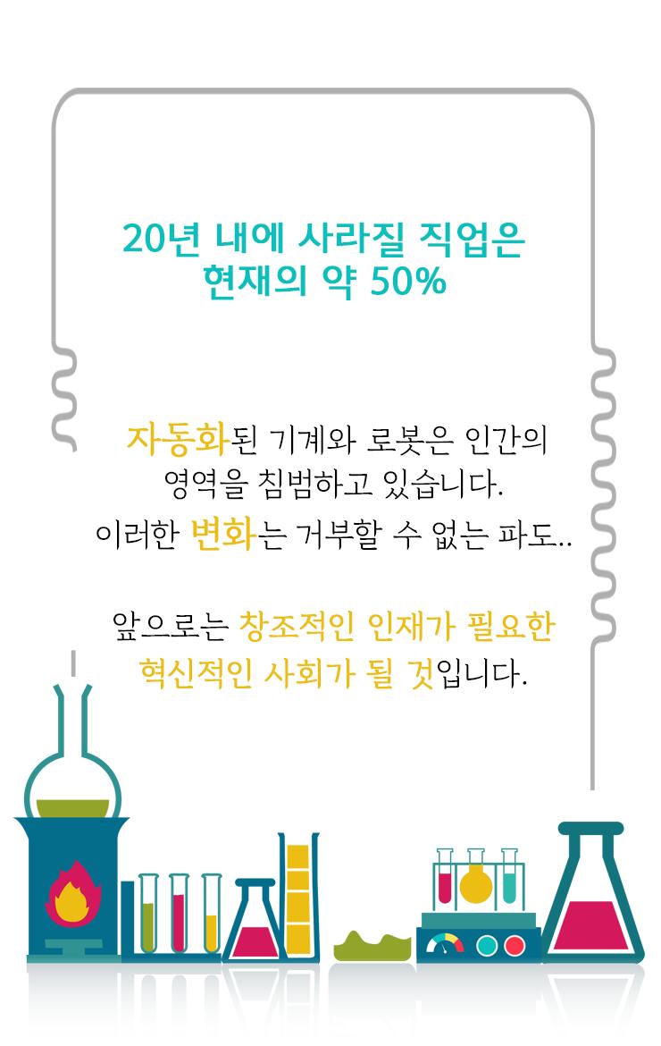 다가올 미래에서는 과거 산업혁명 때처럼 많은 인력이 필요하지 않습니다. 특히 선진국을 향해 가는 우리나라는 더욱 그런 현상이 심해질 가능성이 높습니다. 지금 우리는 제조업 중심에서 창조산업 중심으로 경제 구조가 변하고 있습니다. 결국 창조적이고 뛰어난 인재 1명이 새로운 가치를 만들어내고, 새로운 직업을 만들어낼 수 있는 혁신적인 사회를 경험하고 있습니다.