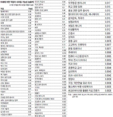 702개의 직업군을 대상으로 조사를 벌였는데, 1에 가까울수록 컴퓨터화로 인해 사라질 가능성이 높은 직업이고, 0에 가까울수록 사라질 가능성이 낮은 직업입니다. 아래의 표를 보면, 텔레마케터, 화물 운송 중개인, 시계 수선공, 보험 손해사정사는 사라질 위험이 큰 직업입니다. 반대로, 레크리에이션을 활용한 치료전문가, 큐레이터, 성직자, 인테리어 디자이너 등의 창의성과 감수성을 요구하는 것은 사라질 위험이 적은 직업입니다.