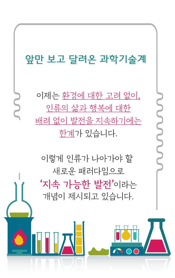 따라서, 이제는 지속가능한 발전을 생각해야할 때입니다. 돈이 된다고 무조건 과학기술을 개발할 것이 아니라, 이제는 과학기술이 인류의 삶과, 환경에 어떤 영향을 주는지, 평화에 기여하는지를 따져보고 해야 합니다.