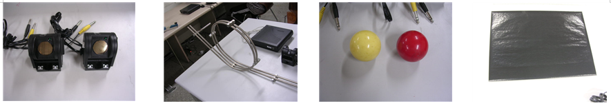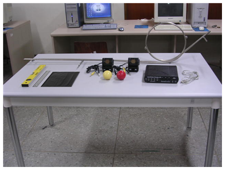 실험b. 2차원 충돌실험 : 인터페이스, 모션센서(2), 레일, 당구공(2), 먹지, 수준기, 자, 각도기