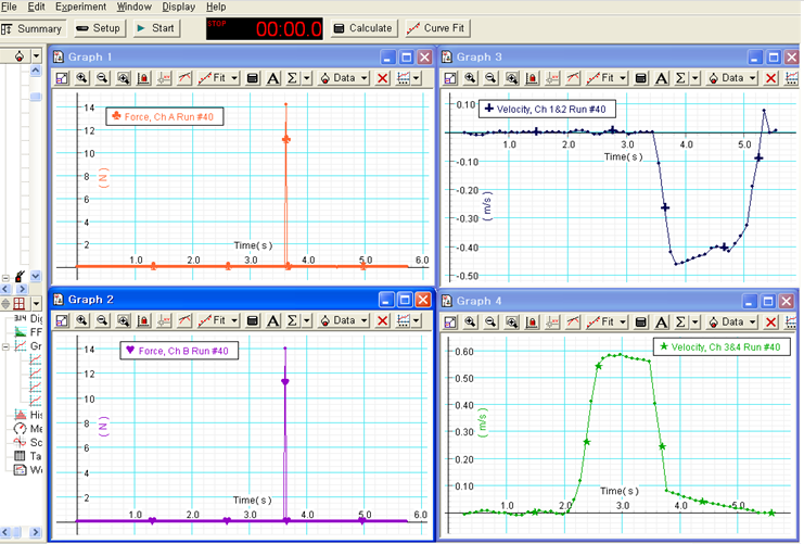분리 실험의 경우 모션 센서만을 사용하였는데 앞에서도 말했듯이 기존의 실험기구를 사용하여 통제가 잘된 상황이었으므로 속력을 구하는 데에 크게 오차가 없었던 것 같다. 충돌 실험의 경우는 충돌 시간이 너무 짧아서 문제가 생겼다. 힘 센서를 제일 높은 200Hz로 설정하였는데도 충돌 시간이 0.01~0.02초 정도밖에 되지 않았기 때문에 센서가 읽어내는 데이터 값이 너무 적었다. 힘 센서가 그리는 힘-시간 그래프에서 얻을 수 있는 면적을 이용하여 충격량을 구했는데 200Hz로 했을 때 데이터 값은 시작점과 끝점을 제외하면 1개 내지 2개 밖에 없었고, 그것에 의존해서 실험값을 얻는 과정에서 오차가 커지게 되었다.