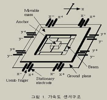 가속도 센서의 구조는 Movable mass와 Anchor가 빔으로 연결이 되어있고, Movable mass에 연결되어 있는 Comb finger와 고정 전극 사이의 커패시턴스의 변화로 가속도를 측정하는 구조로 되어 있다. Anchor는 Ground plane에 연결되어 있어서, Comb finger, Mass, Beam, Anchor 및 Ground plane이 전부 전기적으로 동 전위를 나타낸다. 따라서 이 센서는 축과 축 가속도는 Comb finger와 고정 전극 사이의 커패시턴스 변화로 측정이 가능하다.