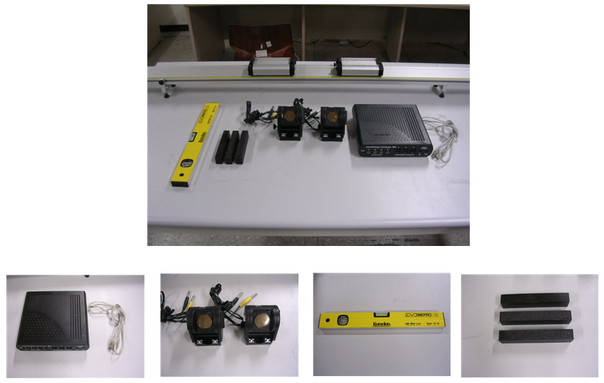 실험a. 1차원 충돌실험 : 인터페이스, 힘 센서(2), 모션센서(2), 충돌실험세트(레일, 수 레2), 수준기, 추